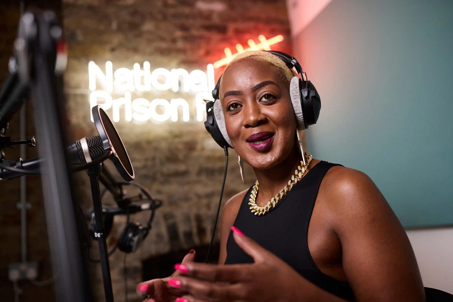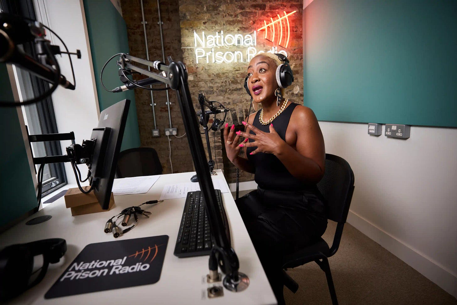 It’s a rainy Thursday afternoon and I’ve just arrived at the secret London location of one of the homes of National Prison Radio (NPR) (the others being inside the walls of nearby HMP Brixton, and inside HMP Styal in Cheshire). Lady Unchained, an award-winning poet, author and broadcaster, is sitting in a soundproof room on the other side of a glass window recording her show Free Flow. Like all broadcasts from NPR, it is only available to residents of His Majesty’s prisons.